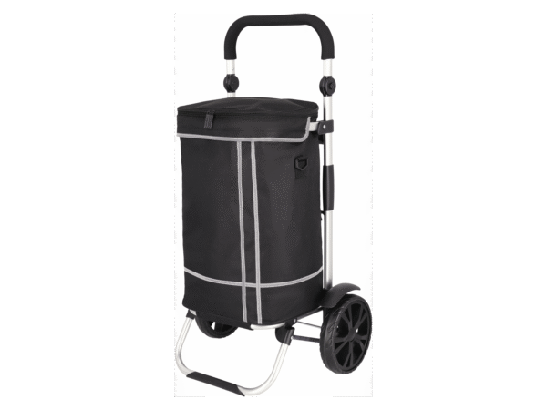 Praktische boodschappentrolley met 2 grote, soepel lopende wielen Geïntegreerde en uitneembare koeltas houdt dranken en etenswaren tot 3 uur I koud, zonder koelelement Ruim hoofdcompartiment met houder aan de zijkant voor paraplu of wandelstok Licht aluminium frame met stabiel draagvlak In hoogte verstelbare Soft-Touch-greep Met winkelwagenchip Met schouderriem en gemakkelijk los te maken klittenbandsluitingen ook apart als draagtas te gebruiken Ruimtebesparend op te bergen door praktisch vouwmechanisme Tas van waterdicht polyester met reflecterende decoratieve streep I getest volgens norm EN 12546-2 Productkenmerken ;} Afmetingen: ca. B 47,5 x H 93 x D 37,5 cm Materiaal: Kunststof Inhoud: Hoofdcompartiment: ca. 40 l, Koeltas: ca. 5 l Kleur: zwart (EAN: 4052916595770)